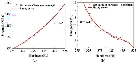 The mechanical properties of materials, including the tensile strength, hardness, and elongation at break, were characterized. Generally, strength, elongation, and hardness are related, and the hardness test is more convenient. In order to accurately estimate the strength and elongation of components through hardness, the test results of tensile strength, hardness, and elongation at break were counted, and then the fitted curves of hardness and tensile strength, and hardness and elongation at break were plotted by polynomial fitting, respectively, as shown in Figure 15. It can be noted from Figure 15 that tensile strength and hardness show a nonlinear positive relationship, while elongation at break and hardness shows a nonlinear negative relationship. The correlation coefficients of the fitted curves are greater than 0.98, thus proving that the fitted curves have higher precision and coherence.