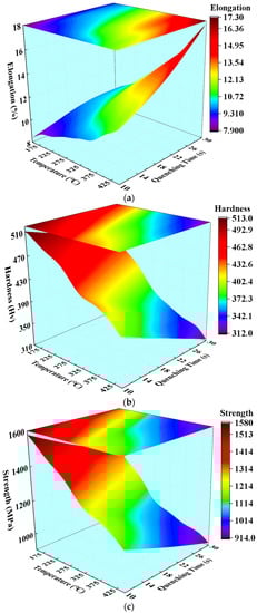 Mapping surfaces of (a) elongation at break, (b) hardness, and (c) tensile strength, which varied with the quenching time and the temperature of the die.