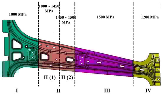 The gradient mechanical property zone of the B-pillar was shown in Figure 17. In Figure 17, the B-pillar was divided into four zones: (I) the energy absorption zone at the bottom, (II) the gradient performance zone between the energy absorption zone and the high-strength zone, (III) the high-strength zone at the middle, and (IV) and the energy absorption zone at the top. The tensile strength of III was 1500 MPa, and the tensile strength of zones I and IV was 1000 MPa and 1200 MPa, respectively. The tensile strength of II was 1000~1500 MPa, which can be subdivided into II (1) the main gradient zone dominated by bainite and martensite mixed microstructures and II (2) the weak gradient zone dominated by martensite (martensite content >95%, tensile strength >1450 MPa). Combined with the zone performance analysis and the mapping surface between the strength and quenching parameters, the quenching temperatures of different zones of the B-pillar were determined, as listed in Table 5.