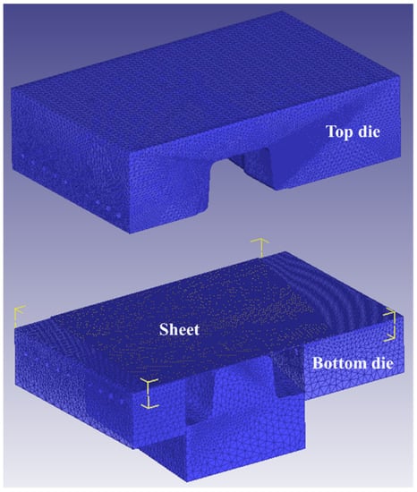 In order to reveal the effect of the quenching time and temperature of the die on the phase-transformation process of UHSS, a thermal-force-phase-coupling model of the hot-stamping process was constructed in DEFORM-3D 11.0 simulation software. Since the die structure was symmetrical, in the FE model, the die structure was simplified, and 1/4 of it was taken for modeling, as shown in Figure 7. Based on the quadrilateral mesh method, the top die and bottom die were meshed as 100,000 elements, respectively, and the sheet was meshed as 25,000 elements. The heating temperature of the sheet was 950 °C. The friction coefficient was 0.3, the holding pressure was 30,000 N, and the pressing speed of the top die was 15 mm/s. In our previous research [19], the multi-phase transformation kinetics model of BR1500HS was developed as follows: