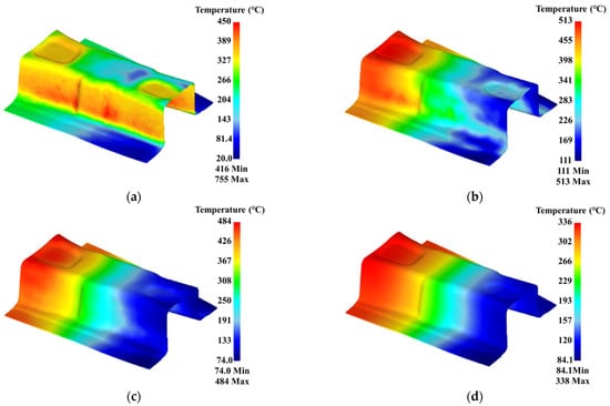 Temperature distribution with time for gradient region of B-pillar: (a) time of 14.6 s, (b) time of 24.6 s, (c) time of 34.6 s, and (d) time of 64.6 s.