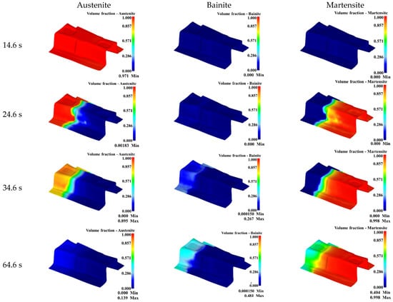 The volume fractions of austenite, bainite, and martensite at different times in the gradient performance zone were displayed in Figure 21. It can be seen from Figure 21 that the B-pillard only underwent a heating and heat-preservation process during the forming stage, during which there was no phase transition. When the quenching time was 10 s, the temperature of the weak gradient zone dropped rapidly into the martensite transformation zone under the action of high die temperature, and martensite transformation occurred. The temperature of some main gradient zone dropped slowly into the bainite transformation zone, and bainite transformation occurred. Meanwhile, the obvious microstructure transition zone could be seen between the main gradient zone and the weak gradient zone. When the quenching time was 20 s, the martensite transformation was basically completed in the weak gradient zone, and the bainite transformation in the main gradient zone was gradually filled with the increase of the quenching time. The maximum of the bainite content in the main transition zone reached 26.7%. During the cooling stage, the main transition zone within the bainite transformation zone continued to carry out the transformation from austenite to bainite with the increasing cooling time. When the time was 64.6 s, the temperature of the main transition zone decreased to the temperature of the martensite transition zone, and bainite transformation ended, with the maximum bainite content of 48.1%. In the main gradient zone, the austenite without martensitic transformation was in the martensitic transformation zone, and then martensitic transformation occurred. The microstructure in the weak gradient zone was almost entirely martensite with high strength, while the main gradient zone was a mixture of martensite and bainite, which has high energy-absorption characteristics.