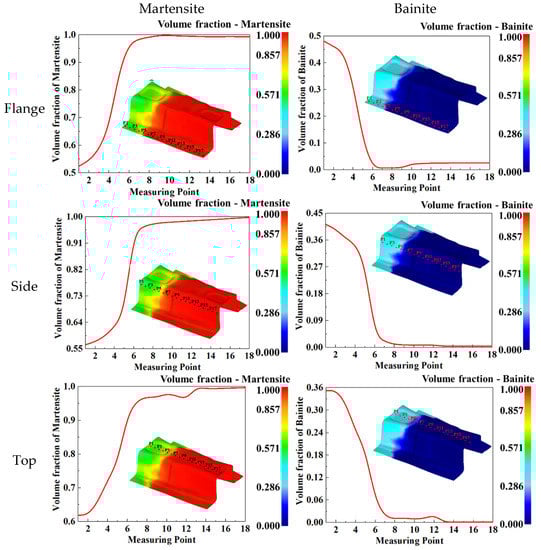 In addition, during the hot-stamping process, the contact time between the B-pillar and die at different positions was different, resulting in different phase transformation processes and final microstructures. Therefore, the final microstructure distribution of three typical parts, namely the flange edge, side wall, and top of the B-pillar, were studied. In order to study the volume fractions of the distribution of bainite and martensite in detail, 18 tracking points were uniformly selected from the flange edge, side wall, and top of the B-pillar, and then the volume fraction curve of bainite and martensite over tracking point was drawn, as shown in Figure 22. As can be seen from Figure 22, in the side wall of B-pillar, the volume fraction of martensite was small at P1 to P4, and it increased rapidly from P4 to P7, and then it reached stability. On the contrary, the variation of the volume fraction of bainite was large at P1 to P4; it rapidly decreased from P4 to P7, and then it reached stability. The variation of volume fraction of martensite and bainite at the flange edge and top of B-pillar was the same as that of side wall. In addition, for the same tracking point, the volume fraction of bainite at the flange edge was the largest, and at the top, it was the smallest; the volume fraction of martensite at the flange edge was smallest, and at the top was the largest. The reason is that the contact time between the die and the sheet was longer, and the time of bainite transformation was more sufficient. It is worth noting that the curve of the volume fraction over the tracking point at the top is not smooth. This is because the top of B-pillar is not flat and has the characteristics of a basin, which affects the temperature change during the quenching process, and then affects the change of microstructure. The simulation results of B-pillar were highly consistent with the abovementioned simulation results of sheet, which can predict the mechanical properties of components. It was confirmed that the mapping relationship of the quenching parameters and the phase and mechanical properties was beneficial and practical to design quenching parameters aiming at different serving conditions in practice.
