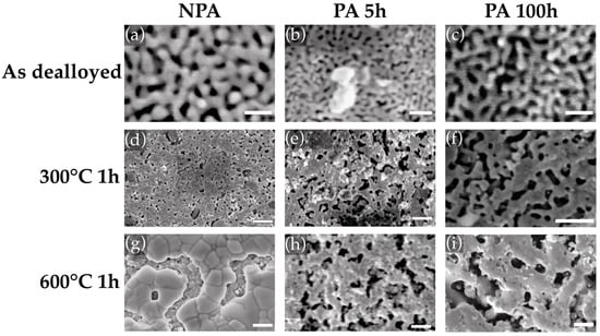 SEM images of NPA NP Au as prepared (a) after thermal treatment for 1 h at 300 °C (d) and 600 °C (g); SEM images PA5h NP Au as prepared (b) after thermal treatment for 1 h at 300 °C (e) and at 600 °C (h); SEM images PA100h NP Au as prepared (c) after thermal treatment for 1 h at 300 °C (f) and at 600 °C (i). Scale bars: (a–c): 100 nm; (d–i): 1 µm.
