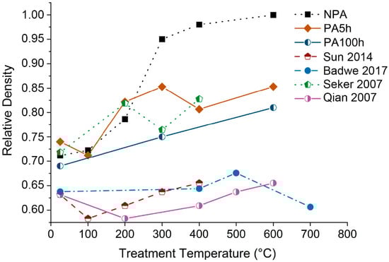 Density trends over annealing temperature of our samples and the literature ones. The samples in the selected reports were submitted to annealing for 10 min (Seker et al. [22] and Sun et al. [23]), 15 min (Badwe et al. [39]), and 120 min (Qian et al. [35]).