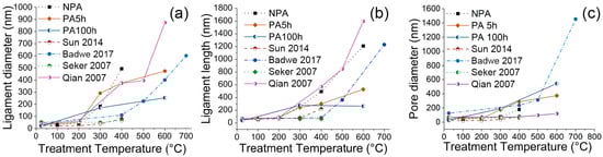 Values of ligament diameter (a), ligament length (b), and pore diameter (c) at different treatment temperatures from image analysis of our samples and the literature ones [22,23,35,39].