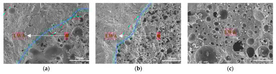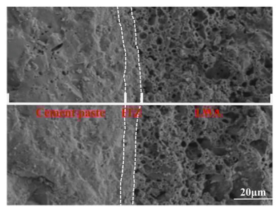 The morphologies of the ITZ of L-UHPC with particle sizes of 0.15–4.75 mm, 0.15–2.36 mm, and 0.15–1.18 mm for the LWA are shown in Figure 7. It can be observed from Figure 7 that the widths of the ITZ of the L-UHPC with particle sizes of 0.15–4.75 mm, 0.15–2.36 mm, and 0.15–1.18 mm for the LWA are 67 μm, 65 μm, and 40 μm, respectively. With the decrease in the LWA particle size, the LWA and the hardened cement paste are closely combined, and there is no obvious interface. This is because the microstructure of the ITZ between the cement paste and the LWA depends largely on the properties of the LWA. Compared with the porous ITZ around the normal weight aggregate, LWA has no wall effect, and the microstructure of the ITZ formed on its surface is comparable to that of the cement paste [44,45,46,47]. Additionally, the surface of the LWA is mostly open pores, which can tightly wrap the cement paste [48]. During the curing process of concrete, the free water of PLWA is slowly released, and the interface area of LWA-cement paste is fully hydrated. Therefore, the ITZ is improved, and the tortuosity of the chloride ion transport path is increased. The LWA surface is rough and has open pores. When the LWA particle size is large, there are more open pores and connected pores on the surface of LWA, the water release rate increases, and the impact range is large, so the width of ITZ is large. The opposite is true when the LWA particle size is small.