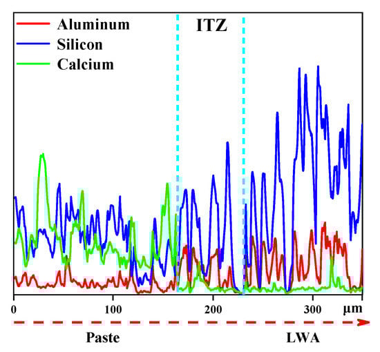 EDS line scan is used to analyze the element distribution of LWA and cement paste to judge the width of the ITZ, as shown in Figure 1.