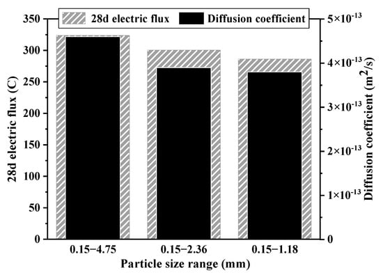 Figure 4 shows the effect of the LWA particle size on the chloride ion transport properties in L-UHPC. It can be observed from Figure 3 that with the increase in the LWA particle size, the chloride ion diffusion coefficient of L-UHPC gradually increases, indicating that the LWA particle size has a great impact on the chloride ion transport properties of L-UHPC. Compared with traditional UHPC whose chloride ion diffusion coefficient is 0.69 × 10−12 m2/s and electric flux range is 400 C [40], when using 0.15–1.18 mm LWA, the chloride ion diffusion coefficient and electric flux of L-UHPC decreased by 44.9% and 28.5%, respectively.