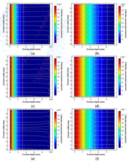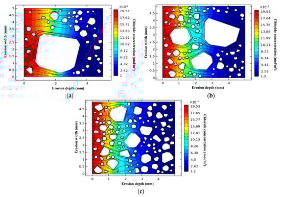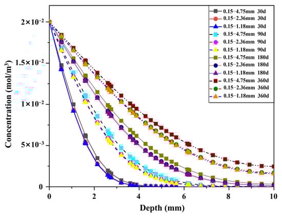 The simulation results of the L-UHPC random aggregate model prepared by LWA with different particle sizes are shown in Figure 13. Due to DITZ being larger than Dcp, the volume fraction of ITZ increases with the increase in LWA particle size, which provides a channel for the rapid transmission of chloride ions. Furthermore, when the volume fraction of LWA is the same, the number of LWA gradually increases with the decrease in LWA particle size, which increases the tortuosity inside the L-UHPC. In the same region, when chloride ions enter the interior of the L-UHPC through surface pores or microcracks, the increased tortuosity of the LWA lengthens the transport path of the L-UHPC. As the transmission distance increases, the chloride ion concentration per unit volume is continuously diluted, and the chloride ion transmission rate continue to decrease [54]. The LWA particle size is reduced, which can effectively hinder the transmission of chloride ions.
