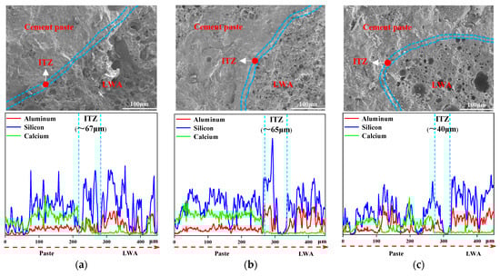 Figure 1 shows the element distribution of LWA-ITZ-cement paste. The left side is the cement paste element distribution, the middle is the ITZ, and the right side is the LWA. It can be observed from Figure 2 that the Si concentrations were observed in the ITZ similar to that in the paste but was lower than in the LWA; the Ca element is mainly distributed in the paste; the Al element is mainly distributed in the LWA, less in the paste and the ITZ. Therefore, the ITZ width of LWA can be calculated by Si, Ca and Al elements [28,32,33].