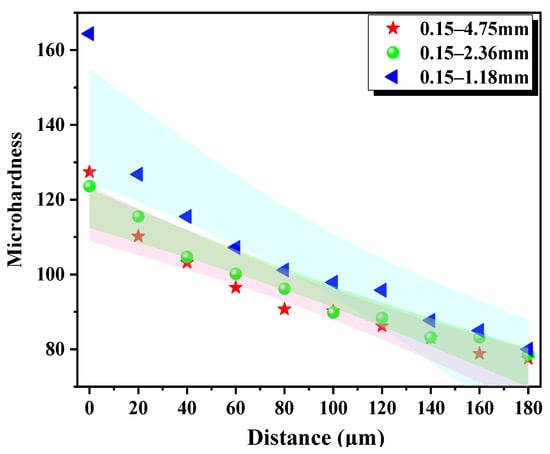 Microhardness of LWA-ITZ-hardened cement paste of LWA with different particle sizes. Colored bands represent 95% confidence band.