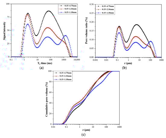 Effect of LWA particle size on the pore structure of L-UHPC. (a) Effect of LWA particle size on the T2 spectra of L-UHPC; (b) effect of LWA particle size on the pore size distribution of L-UHPC; (c) effect of LWA particle size on the cumulative pore size distribution of L-UHPC.