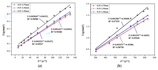 PLWA provides additional water for the continuous hydration of cement in L-UHPC and the pozzolanic reaction of auxiliary cementitious materials, so ITZ is enhanced, which reduces the internal porosity and permeability of L-UHPC [51,52]. Meng [53] reported that the partial replacement of river sand with pre-wet fine sand in UHPC can effectively reduce the total porosity of UHPC. Pores are an important channel for chloride ion transport in L-UHPC. The pores in L-UHPC can be divided into two types: one is the pores of the LWA itself, and the other is the pores in the hardened cement paste. Generally speaking, the pore size range in cement paste is smaller than that of LWA [54]. It can be observed from Figure 9 that reducing the LWA particle size not only reduces the content of small pores and macropores but also accelerates the accumulation rate of small pores, effectively refines the internal pore structure of L-UHPC, and reduces the total porosity of concrete. Moreover, it can be observed from Figure 10 that reducing the LWA particle size reduces the primary and secondary adsorption coefficient of L-UHPC and effectively improves the capillary structure of L-UHPC. Liu [55] reported that under the same LWA content, the incorporation of LWA with a smaller particle size into ultra-high-strength concrete (UHSC) could increase the volume of protective slurry, thereby reducing the permeability of UHSC.
