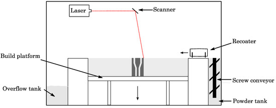For laser powder bed fusion, we employed a Realizer SLM 50 (DMG Mori, Bielefeld, Germany) equipped with a 100 W yttrium fiber laser (YLM-100; IPG Photonics, MA, USA). The spot size of the laser was set to dspot = 20 μm at focus position. The machine processed under an argon atmosphere with a 0.1% oxygen level. The build platform was kept at 200 °C to maintain the part at an elevated temperature, to avoid deformation by curling due to residual stress. The machine parameters used included a layer thickness of 25 µm, hatch distance of 60 µm, laser power of 55 W and an exposure time of 20 µs. A schematic of the machine used is depicted in Figure 1. In the machine, the powder is transported by a screw conveyor from the powder tank towards the recoater. The recoater distributes the powder as a thin layer all over the build platform and surplus powder is dumped into an overflow tank. The powder on the build platform is locally melted and welded by a fiber laser to the underlying metal part. Then, the build platform moves downwards and the process starts again to perform the next layer until the part is built completely.