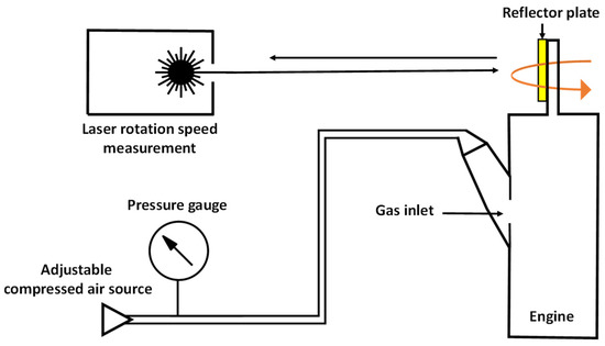 Both the engine and the measuring device were statically fixed in order to ensure a reproducible measurement setup. The measurement device was directed to the reflector plate by a guide laser. The engine was supplied with compressed air via an 8 mm hose and the inlet gas pressure was measured with a pressure gauge. For the measurements, the compressed air was switched on and adjusted to the desired pressure. After waiting for two seconds to ensure that the pressure reached the engine and the engine reached a stable rotation speed, the median value of the five following displayed rotation speeds on the measuring device was used.
