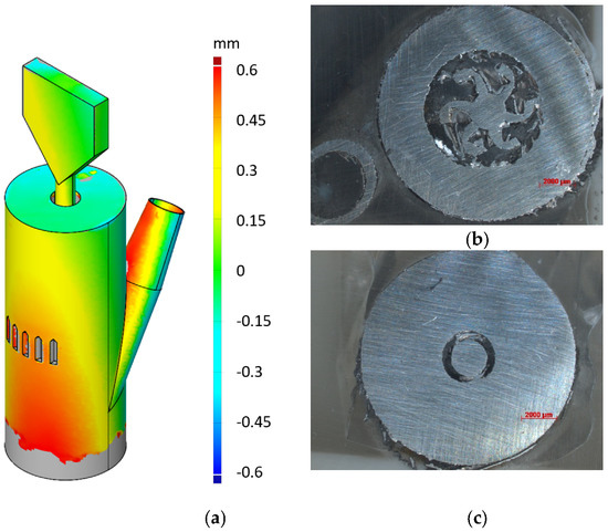 Figure 4. (a) An optical 3D scan and false color representation of the LPBF built device showing shape and dimensional deviations. Cross section microscope images of (b) the turbine and (c) the shaft.
