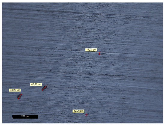 To provide a closer look into the material in order to determine pore behavior, a micrograph of the cross section is shown in Figure 5. Here, various sized pores are visible with a maximum size in the range of 50 µm, but such large pores were quite low in number. More often, pores with sizes between 10 µm and 20 µm were found. This is not unusual because literature results reveal the porosity of Inconel as build samples, depending on the laser parameter combination, between 0.8% and 3%, with a typical pore size of 10 µm to 40 µm, and with maximum pore sizes of 200 µm beyond the material surface [29].