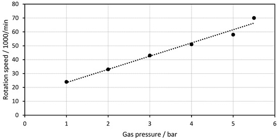 As a key performance characteristic, idle rotation speed is measured as a function of applied air pressure for the optimized motor. The measured rotation speed for a motor with 1 mm gas inlet size as a function of the air pressure is shown in Figure 6. The rotation speed increased linearly with air pressure from 24,000 rpm at 1 bar to 70,000 rpm at 5.5 bar. This increase in rotation speed with the gas pressure is typical for air motors [36]. The linear behavior simplifies the control of the motor and makes it flexible due to the wide range of rotation speed.