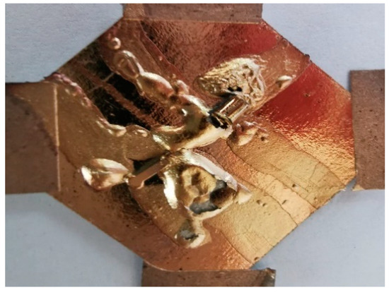 The test samples from the two polyamide materials, under the two different technological modes, were plated in 24-carat gold powder (Figure 2) and were scanned using SEM in four different magnifications: ×1000, ×3000, ×5000, and ×10,000.