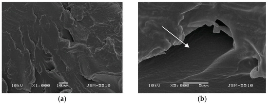 Observations of the surface of TS test samples prepared under the modified technological mode show significant differences in the surface characteristics compared to the test samples injected under the optimal technological mode. Under ×1000 magnification, smoothening of the texture is observed, where shallow grooves and unevenness with a bubble-like shape can be seen; the structure is slightly wavy (Figure 6a,b). Under a magnification of ×5000, the surface is orange peel-textured; however, the uneven areas and deep defects do not exceed 1–3 microns. It should be noted that the refinement of the surface texture of this material is a direct result of the technological mode modification, but the effect on the mechanical properties has yet not been investigated.