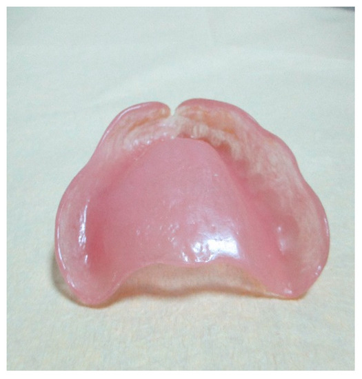 - Takabayashi, Y. Characteristics of denture thermoplastic resins for non-metal clasp dentures. Dent. Mater. J. 2010, 29, 353–361. [Google Scholar] [CrossRef] [PubMed]