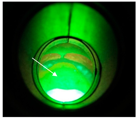 The method of direct fluorescence visualization with the help of the VELscope® (LED Dental, Inc., White Rock, BC, Canada) device was applied. Contamination not only of the mucosa (Figure 8a,b) beneath the denture but also on the denture surface itself was ascertained (Figure 9).