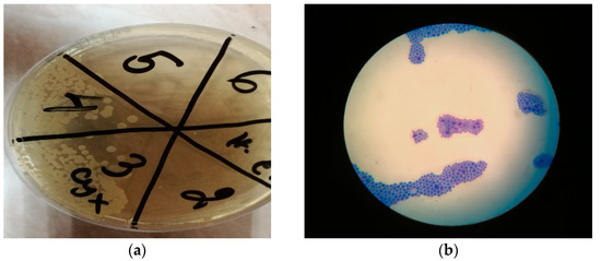 (a) SDA agar. Fungal growth on 3 (sample taken from the palate) and 4 (sample taken from the denture). No fungal growth observed on the negative control (n. c.). 2—sample from the vibrating line area, 5—sample from tuber maxillae sin., 6—sample from tuber maxillae dex. (b) Fungi, methylene blue stain, ×100 immersion oil microscopy.