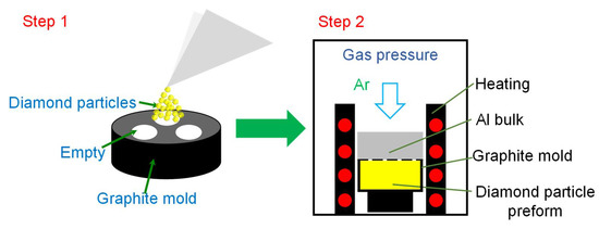 The diamond/Al composites were fabricated by a homemade gas pressure infiltration facility. The schematic illustration of the preparation of the diamond/Al composites is displayed in Figure 1. The diamond particles were densely vibrated into a graphite mold to form diamond particle preform, and then the graphite mold was covered by an Al bulk. The Al bulk was heated to 1073 K and maintained for 30 min before an Ar gas pressure of 1.0 MPa was applied for infiltration. The infiltration was performed at 1073 K for 20 min under the pressure of 1.0 MPa. Then, the sample was cooled down to room temperature in the chamber. The diamond volume fraction of the 66 μm and 272 μm-diamond/Al composites were 58.2% and 59.2%, respectively.
