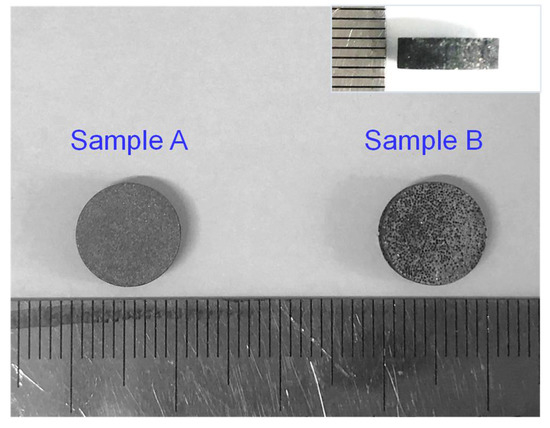 The TC of the diamond/Al composites was calculated by the equation λ = αρCp, where the α is thermal diffusivity, ρ is sample density, and Cp is specific heat capacity. The thermal diffusivity was measured with a laser flash equipment with a testing error less than 3% (LFA467, Netzsch, Selb, Germany) using a standard sample with the dimensions of Φ10 mm × 3 mm, as shown in Figure 2. Sample A and sample B refer to the 66 μm- and 272 μm-diamond/Al composites, respectively. The sample density ρ was examined by the Archimedes method. The specific heat capacity Cp was derived from the rule of mixture based on the mass fraction of each component.