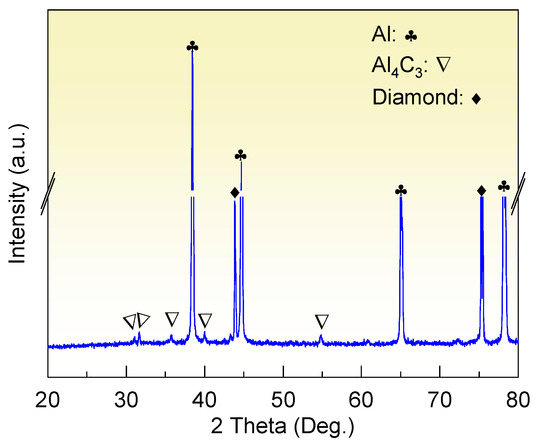 With the ongoing breakthrough of process technology, electronic devices are integrating more components, and the power density is reaching a very high level [1,2]. High-power electronic devices are subjected to heat dissipation and are difficult to advance further due to the low thermal conductivity (TC) of traditional thermal management materials [3]. Diamond particles reinforced Al matrix (diamond/Al) composite enjoys high TC, tunable coefficient of thermal expansion (CTE), and suitable mechanical properties, and is acting as an ideal material for heat dissipation of high-power electronics [4,5,6,7]. The diamond/Al composites with high TC and light specific weight provide a desirable candidate for thermal management applications in the field of lightweight-vehicle and aerospace engineering.