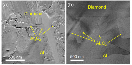 The XRD analysis in Figure 3 suggests that the diamond/Al composite is composed of diamond, Al, and Al4C3. The characteristic peaks at 31.1°, 31.7°, 35.7°, 40.1°, and 55.0° indicate the generation of the Al4C3 phase in the diamond/Al composites. The interfacial structure of the diamond/Al composites was characterized via STEM before thermal cycling. As displayed in Figure 4a,b, the in situ formed Al4C3 phase is discrete on both diamond particle (100) and (111) surfaces, which helps to connect the diamond particle and the Al matrix closely owing to a pinning effect. The discrete in situ Al4C3 phase grows from the diamond particle surfaces and then pierces into the Al matrix, which creates an interlock structure and thus strengthens the interface. The surface morphologies of the diamond particles in the diamond/Al composites before and after 200 thermal cycles are compared in Figure 5. The discrete morphology of the Al4C3 phase on the diamond particles does not change after thermal cycling. The low thermal cycling temperature cannot provide enough energy for the growth of Al4C3. The unchanged morphology of the discrete Al4C3 phase on the diamond particle surfaces indicates that the strong interface is maintained after thermal cycling. It is noted that more Al4C3 phase is formed on the larger diamond particle surfaces when comparing Figure 5a,b with Figure 5c,d. This suggests that stronger interface is formed in the diamond/Al composite with larger diamond particles.