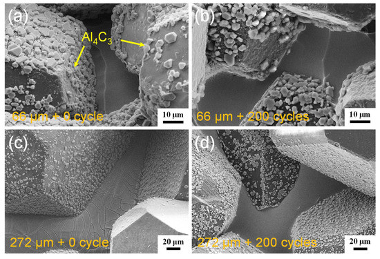 Figure 6 displays the fracture surfaces of the diamond/Al composites before and after 200 thermal cycles. The fractured diamond particles, the residual Al matrix on the diamond particle surfaces, and the Al dimples are clearly observed on the fracture surfaces of the diamond/Al composites. This reveals that the fracture starts from the Al matrix or the diamond fillers, and that the bonding strength of the diamond/Al interface is higher than the fracture strength of pure Al and synthetic diamond containing defects. The fracture surface morphology of the diamond/Al composites does not change after thermal cycling. Wang et al. [20] reported that the interfacial gap emerges at the diamond (111)/Al interface due to the “net” (no Al4C3) interface after 200 thermal cycles. In this study, both the diamond particle (100) and (111) surfaces are densely covered with Al4C3 phase, as shown in Figure 5a,c. After 200 thermal cycles, both the diamond (100)/Al and diamond (111)/Al interfaces are tightly bonded and interfacial gaps are not observed, as shown in Figure 6b and d. The diamond/Al composites can withstand the thermal cycling, which is a result of the interfacial Al4C3 phase. First, the Al4C3 phase in situ grows on diamond particle surfaces and realizes a chemical bonding, forming the strong diamond/Al interface. Second, Al4C3 has a CTE of 8.0 × 10−6 K−1 [23] in between diamond and Al, which reduces the generation of thermal stress at the interface during heating and cooling. Third, the discrete morphology of the Al4C3 phase further releases the concentration of interfacial thermal stress. Comparing the diamond/Al composites with small diamond particles (Figure 6a,b), more fractured diamond particles and less smooth diamond particle surfaces are observed in the diamond/Al composite with large diamond particles (Figure 6c,d), indicating a stronger interface. This is consistent with the more Al4C3 generated on the large diamond particle surfaces, as presented in Figure 5c,d.