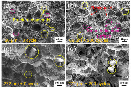 Fracture surfaces of the diamond/Al composites with different diamond particle sizes before thermal cycling: (a) 66 μm and (c) 272 μm, and after 200 thermal cycles: (b) 66 μm and (d) 272 μm.