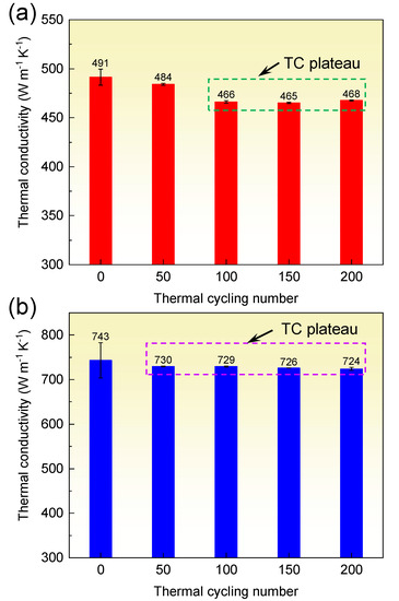 where is the varied value of resistivity per unit length of dislocation, and is the dislocation density. In the metal matrix composite, the dislocation density in the metal matrix improves significantly after thermal cycling [27,28]. As a result, the electrical resistivity of the Al matrix is enhanced according to Equations (1) and (2), and the TC of the Al matrix is lowered. Then, the TC of the diamond/Al composite is decreased. Moreover, the scattering of heat carriers at the diamond/Al interface is enhanced owing to the accumulation of the dislocations created by the concentration of interfacial thermal stress, which further hinders the heat transport at the diamond/Al interface and lowers the TC in the composites. To evaluate the decrease of TC in the Al matrix, a theoretical model [29] was employed to back-derive the TC of the Al matrix after thermal cycling. The results are shown in Table 2. Assuming a TC of 237 W m−1 K−1 for the Al matrix before thermal cycling, the TC of the Al matrix decreases apparently after thermal cycling. The decrease in TC of the Al matrix is reasonable in practice. Ye et al. [30] found that the TC of Cu declines linearly with the increasing tensile strain of Cu. The decrease in electrical conductivity of metals due to plastic strain has also been reported. Narutani and Takamura [31] suggested that the electrical conductivity of Ni decreases constantly as the dislocation density increases with plastic strain. Cho et al. [32] suggested that the electrical conductivity of the Al alloy drops as the plastic strain increases. The lowered electrical conductivity by plastic strain reduces the TC in metals according to the Wiedemann–Franz law. With the rising of the thermal cycling number, the plastic strain in the Al matrix increases, and the electrical conductivity of the Al matrix declines accordingly, which reduces the TC of the Al matrix.