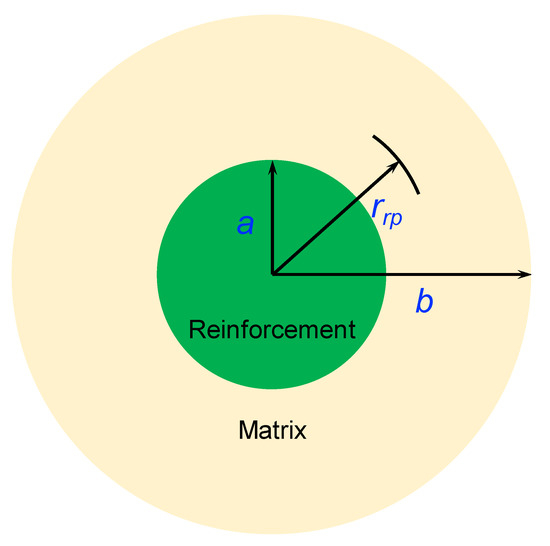 Olsson et al. [35] suggested a theoretical model to analyze the plastic strain in metal matrix composites during thermal cycling. The composite is supposed to be composed of two concentric spheres with different materials. The hollow sphere represents the metal matrix and the inner sphere represents the reinforcement, as shown in Figure 8. The a and b refer to the radii of the reinforcement and the matrix, respectively. The representative volume element is a spherical unit with a radius r. Then, a < r < b refers to the matrix region, and 0 < r < a refers to the reinforcement region. The reinforcement volume fraction is thus calculated as . For simplification, the following assumptions are necessary: (a) only the matrix performs the plastic deformation; (b) the matrix is an ideal elastic–plastic material; and (c) the matrix enjoys equal tensile and compressive yield strengths with no dependence on temperature. The plastic strain at r (a < r < b) in the composite after n (n > 1) thermal cycles can be calculated by: