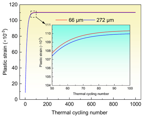 The material parameters for calculating the plastic strain at the diamond/Al interface are shown in Table 3. Assuming the interfacial bonding of the diamond/Al composites is infinitely strong, the plastic strain at the interface can be calculated. Figure 9 shows the calculated plastic strain after 1000 thermal cycles. It is notable that the plastic strain improves as the thermal cycling number increases. The plastic strain rises dramatically in the first 50 thermal cycles, and then the increase drops during the 50–100 thermal cycles. When the thermal cycling number exceeds 100, the plastic strain approaches constant. The calculations of the plastic strain are in broad agreement with the TC variation in Figure 7. According to the Taylor equation [36], the flow stress σ and dislocation density present a positive relationship of σ ∝ . The dislocation density in metals increases with the increasing of the plastic strain in metals, as evidenced by Narutani and Takamura [31] and Cho et al. [32]. In the diamond/Al composites, the dislocation density in the Al matrix increases rapidly during the first 50 thermal cycles due to the large increase of plastic strain, which decreases the TC of the Al matrix. Thus, the TC of the 66 μm- and 272 μm-diamond/Al composites is apparently decreased. During the 50–100 thermal cycles, the small increase of the plastic strain implies that the dislocation density increases slowly, and the dislocation gradually saturates in the Al matrix. In the 66 μm-diamond/Al composite, the Al matrix is divided into numbers of small-scale units by the small diamond particles, and each Al unit has a high dislocation density due to the high plastic strain. This results in the decrease in TC of the Al matrix and therefore lowers the TC of the composite during the 50–100 thermal cycles, as shown in Figure 7a. While the Al unit in the 272 μm-diamond/Al composite is larger than that in the 66 μm-diamond/Al composite, the Al unit has a lower dislocation density because of the lower plastic strain. Thereby, the TC of the Al matrix is moderately affected, and the TC of the composite presents a stable value during the 50–100 thermal cycles, as shown in Figure 7b. After 100 thermal cycles, the plastic strain increases hardly, which implies that the dislocation density in the Al matrix is at a stable level. Accordingly, the TC of the Al matrix is unchanged, and the TCs of both the diamond/Al composites remain stable.