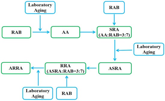 Penetration grade 60/80 raw asphalt binders (RAB) were used to prepare the re-recycled asphalt binders. Table 1 shows the basic indicators for RAB. In order to simulate the current production of the hot central-plant recycling, this study used 30% aged asphalt binder mixed with 70% raw asphalt binder without a rejuvenating agent to simulate recycling. The re-recycling sample preparation methods follow: (1) According to the thin-film oven test (TFOT) method in ASTM D1754, the RAB was aged at 163 °C for 5 h to simulate short-term aging. (2) After aging at 163 °C for 5 h, the TFOT RAB was placed in a pressure-aging vessel (PAV) and aged at 100 °C and 2.1 MPa for 20 h to prepare the aged asphalt (AA) for simulating long-term aging according to ASTM D6521. (3) The single recycled asphalt binder (SRA) with RAB: AA as 7:3 was prepared. (4) After preparing the SRA, the SRA used the TFOT and PAV methods to prepare the aged single recycled asphalt binder (ASRA). (5) Re-recycled asphalt binder (RRA) with RAB: ASRA as 7:3 was prepared. (6) After preparing the RRA, the RRA used the TFOT and PAV methods to prepare aged re-recycled asphalt binders (ARRA). Figure 1 shows the detailed preparation process. Table 2 shows the sample ID and corresponding description.