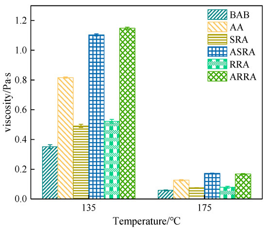Figure 2 demonstrates that the viscosity of recycled asphalt is greater than that of RAB; recycling reduces the construction ease of recycled asphalt pavement. In addition, the viscosity of RRA is greater than that of SRA at 135 and 175 °C. Re-recycling increases the viscosity of asphalt; previous studies also show that multiple recycling reduces the workability and the compactibility of recycled asphalt pavement [18].