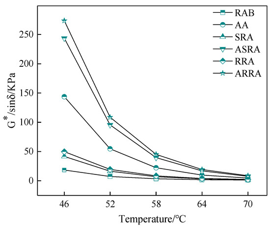 Figure 4 shows that the G*·sinδ of recycled asphalt is greater than that of RAB; recycling significantly increases the G*·sinδ and reduces the fatigue performance of asphalt binder. The G*·sinδ of the RRA is larger than that of the SRA; the re-recycling reduces the fatigue performance of asphalt. Thus, the fatigue performance of multiple recycled asphalt should be taken seriously [19,20]. In addition, the fatigue performance gap between RRA and SRA increases after aging, indicating that the aging resistance of recycled asphalt decreases with recycling times.
