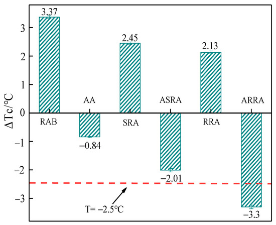 Figure 6 demonstrates the ΔTc of asphalt binders. Figure 6 shows that the differences between SRA and RRA are small in ΔTc. However, the ARRA ΔTc ≤ −2.5 °C indicates that the ARRA will be at risk of low-temperature cracking. Therefore, ΔTc can be used as an effective index to evaluate the low-temperature performance of re-recycled asphalt binders [22].