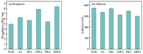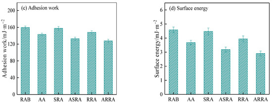 The Johnson–Kendall–Roberts (JKR) contact mechanics model was used to calculate the adhesion work between the asphalt binder and the probe [29]. In addition, the adhesion work was converted into surface energy based on the Fowkes model [30]. The calculated results are shown in Figure 8.