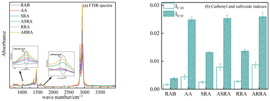 The carbonyl peak at 1700 cm−1 and the sulfoxide peak at 1030 cm−1 in FTIR spectra are often used to characterize the aging degree of asphalt binder. Figure 9 demonstrates the carbonyl and sulfoxide index. Compared to RAB, IC=O of SRA and RRA increase by 56.25% and 75%, respectively, and IS=O of SRA and RRA increase by 244.7% and 257.9%, respectively. Re-recycling promotes the accumulation of aged functional groups in the asphalt. Thus, re-recycling improves the high-temperature performance and reduces the fatigue and low-temperature performance of asphalt. Compared to AA, IC=O of ASRA and ARRA increase by 79.55% and 97.73%, respectively. Aging promotes the accumulation of aged functional groups in the re-recycled asphalt; therefore, re-recycling reduces the anti-aging performance of asphalt. In addition, compared to AA, the IS=O of ASRA and ARRA increase by 2.02% and 4.44%, respectively. The IS=O between ASRA and ARRA change less; this finding is consistent with Kriz [11] and Hugener [12]. Without considering the miscibility of the aged and raw asphalt, SRA contains 30% aged and 70% raw asphalt. When SRA undergoes aging again, most of the sulfur in the 30% aged asphalt was consumed due to sulfur being more reactive than carbon [35]; only the sulfur in 70% raw asphalt generates sulfoxide, such as RRA. Therefore, the IS=O between ASRA and ARRA changed less.