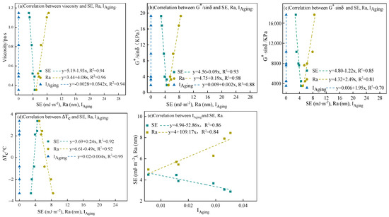 The changes in the rheological properties of asphalt are related to its microstructure [36,37]. Therefore, the rheological property parameters (viscosity at 135 °C, G*/sinδ at 64 °C, G*·sinδ at 16 °C, and ΔTc) were established to correlate with roughness (Ra), surface energy (SE), and aging index (IAging= IS=O + IC=O).