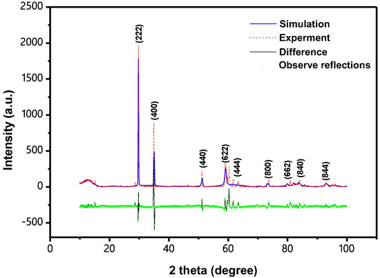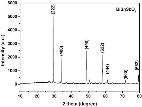 Figure 3 shows the XRD pattern of BiSnSbO6 and marks the individual diffraction peaks. The structure of BiSnSbO6 was tested by the XRD technique. From the analysis of the results, we might conclude that BiSnSbO6 was a single phase and the building block parameters could be equivalently a = b = c = 10.234594 Å. By analyzing the above results, it is shown that BiSnSbO6 possesses a pyrochlore structure and the cubic system; simultaneously, the space group was Fd3m and the crystallization of BiSnSbO6 was good.