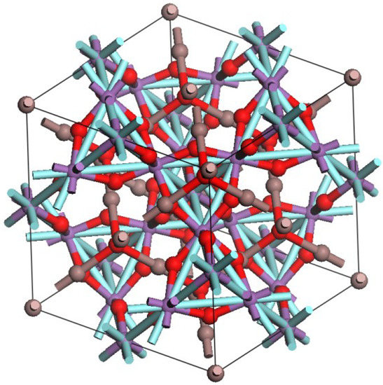 Atomic structure of In2YSbO7. (Red atom: O; cyan atom: In; purple atom: Y or Sb.).