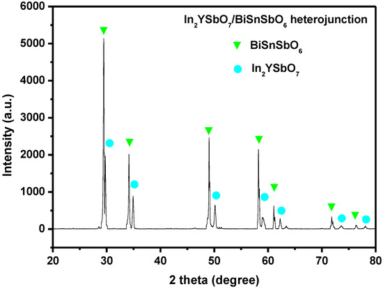 Figure 4 shows the XRD spectrum of IBHP. As can be seen from Figure 4, there were pure single-crystal In2YSbO7 photocatalyst and pure single-crystal BiSnSbO6 photocatalyst. The diffraction peaks of In2YSbO7 and BiSnSbO6 were marked successfully, and no other impurities were found.