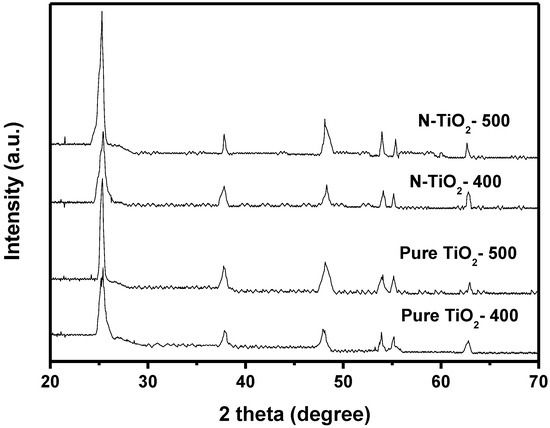 Figure 5 shows the X-ray diffraction patterns of N-TiO2 and pure TiO2. The structure of N-TiO2 and pure TiO2 was tested by XRD technology. N-TiO2-500 was calcined at 500 °C and N-TiO2-400 was calcined at 400 °C. It can be seen from Figure 5 that N-TiO2 or pure TiO2 was mainly composed of anatase phase.