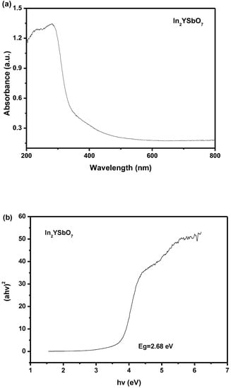 (a) UV–vis diffuse reflectance spectra of In2YSbO7; (b) Plot of (αhν)2 versus hν for In2YSbO7.