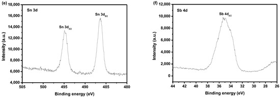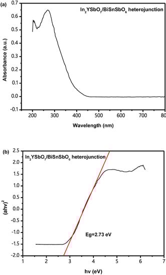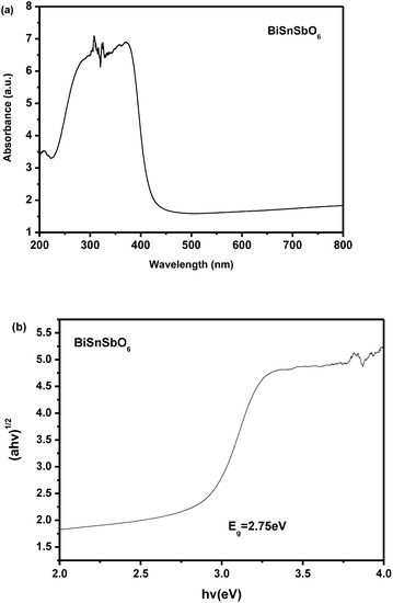Figure 7a,b shows the U–V DRS of BiSnSbO6. According to the results analysis which was based on Figure 7a,b, the Eg value of BiSnSbO6 is estimated to be 2.75 eV. The reckoning value of n was about 2, and the optical transition of BiSnSbO6 was an indirect transition.